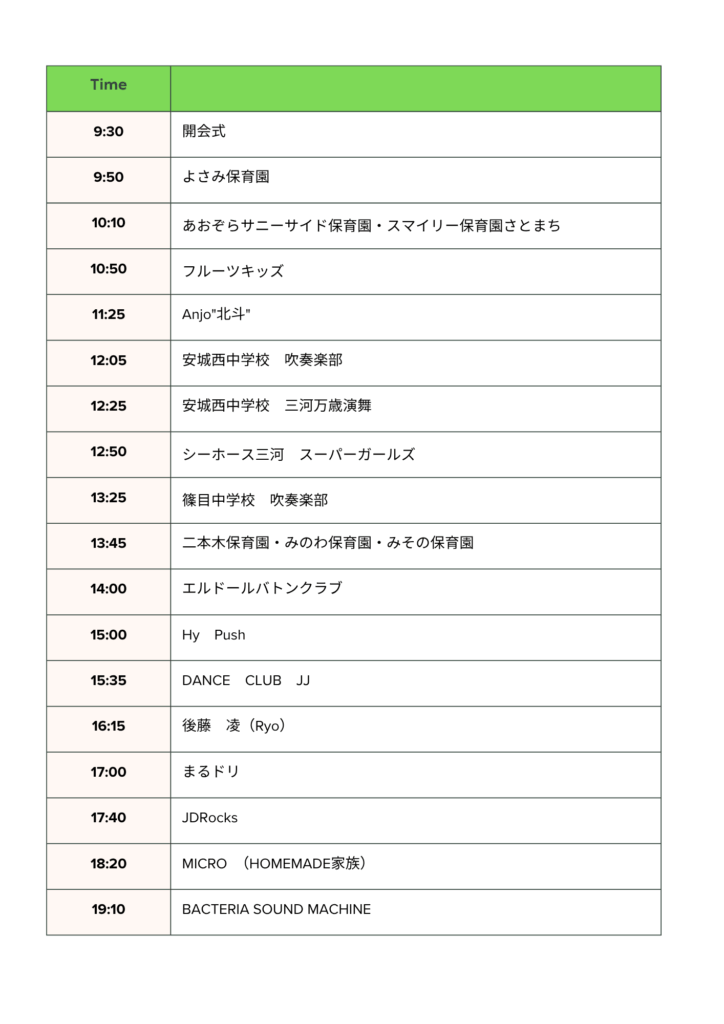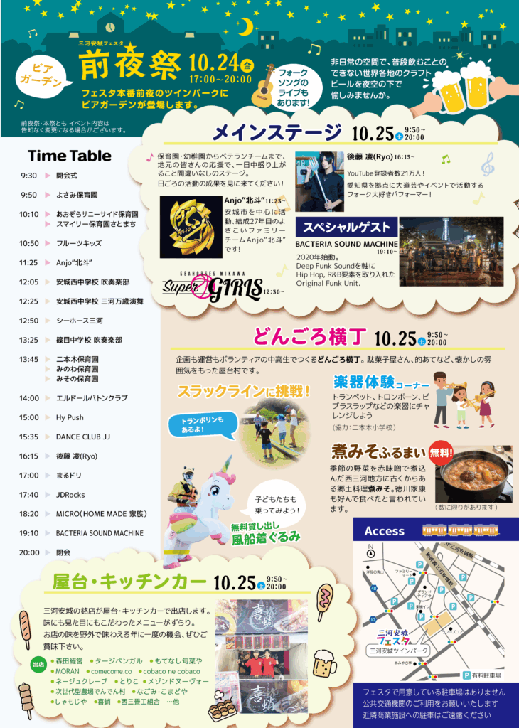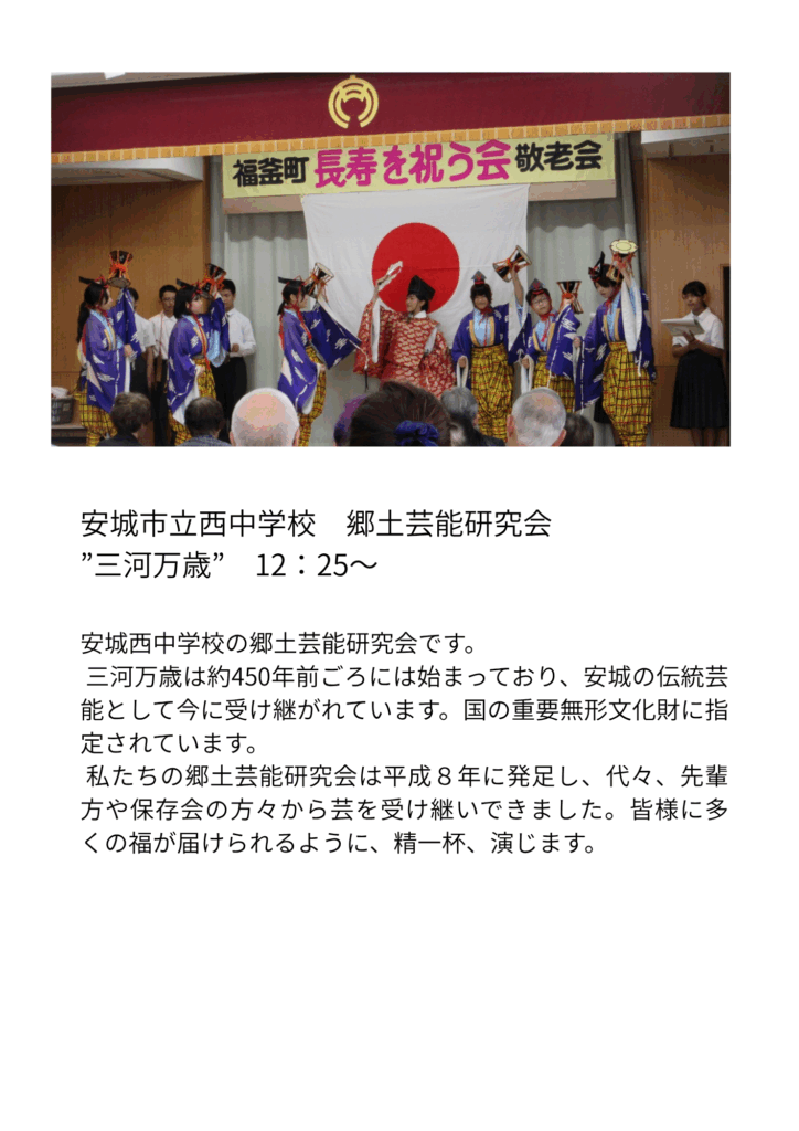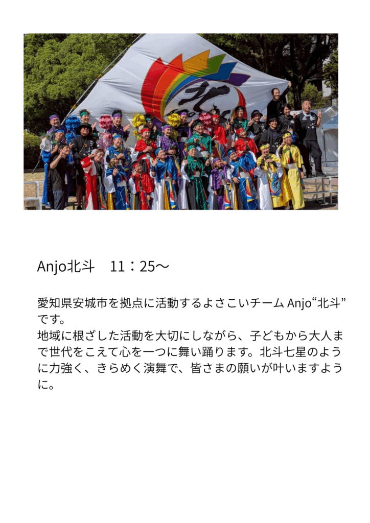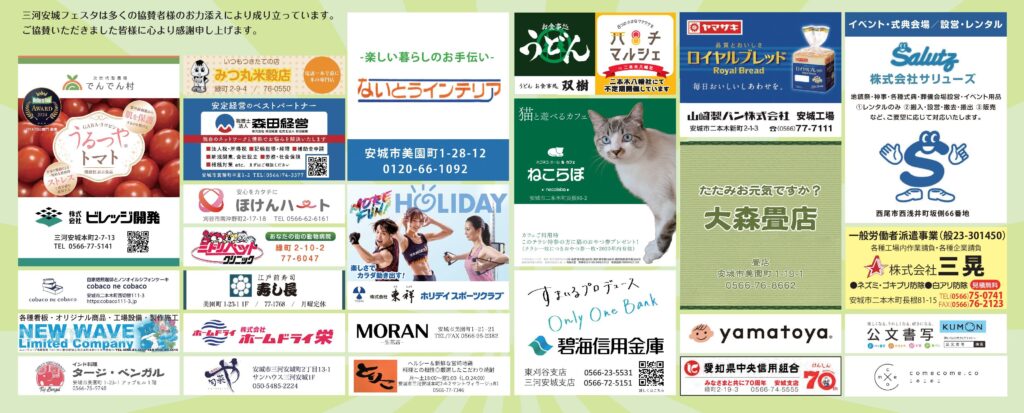 後援 / 安城市、安城市教育委員会、安城商工会議所、二本木連合町内会、依佐美・美園住宅町内会、箕輪町内会、横山町内会、井杭山町内会、消防団二本木分団、寺子屋 『Dear。。。』、子宝保育園